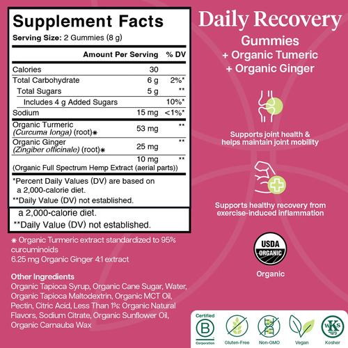 최고의 식물성 성분으로 구성된 드림팀을 모았습니다. 전 스펙트럼 헴프, 강황, 그리고 진짜 생강 구미는 관절 건강을 지원하고 운동으로 인한 염증 관리에 도움을 주어 여러분이 최고의 기량을 계속 발휘할 수 있도록 합니다 .