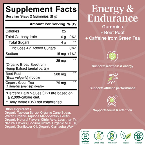 트레일 러너, 스키어, 그리고 활동적인 모든 분들을 위한 제품입니다. 패션프루트 맛 구미는 광범위한 스펙트럼의 헴프 오일과 비트루트, 녹차를 함유하여 부드럽고 지속적인 에너지를 제공합니다. 에너지 고갈 현상 없이 하루 종일 활력을 유지하세요.