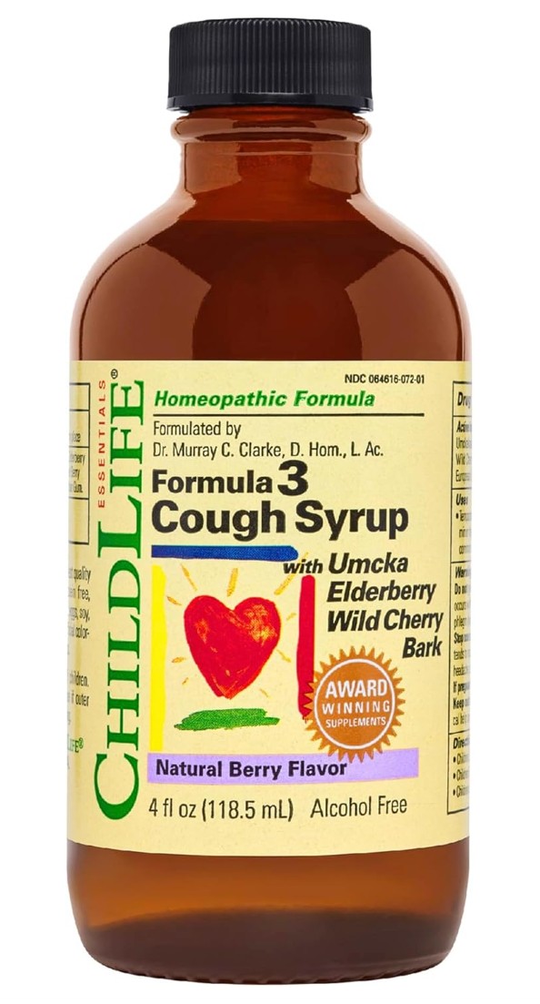 CHILDLIFE Essentials Formula 3 Kids Cough Syrup - Children's Cough Medicine for Kids 2-11, with Umcka, Elderberry & Wild Cherry Bark, Gluten Free - Natural Berry, 4 Fl Oz