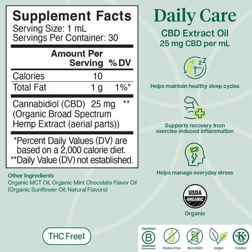 샬롯츠 웹™ 데일리 케어 CBD 오일(25mg)은 광범위 스펙트럼 CBD 오일로, THC† 없이 일상적인 균형을 위해 제조되었습니다. 운동선수, 직장 내 약물 검사가 필요한 분, CBD를 처음 접하는 분, 또는 민감한 라이프스타일을 유지하면서도 매일 건강을 챙기고 싶은 모든 분께 적합합니다.