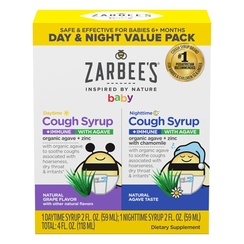 Zarbee's의 Day & Night Value Pack에는 천연 포도 맛의 주간 기침 시럽 + 면역 2액량 온스와 천연 아가베 맛의 야간 기침 시럽 + 면역 2액량 온스가 들어 있어 하루 중 언제든지 아이를 돌볼 수 있습니다.